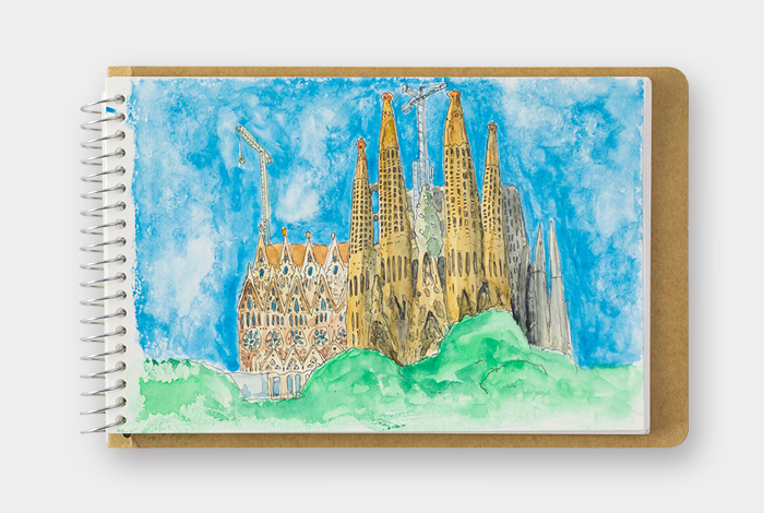 This is a notebook with watercolour paper on which the colours come out well. Not only painting with watercolour but also drawing with a pencil or a pen is recommendable, as well as collage of photos and tickets.