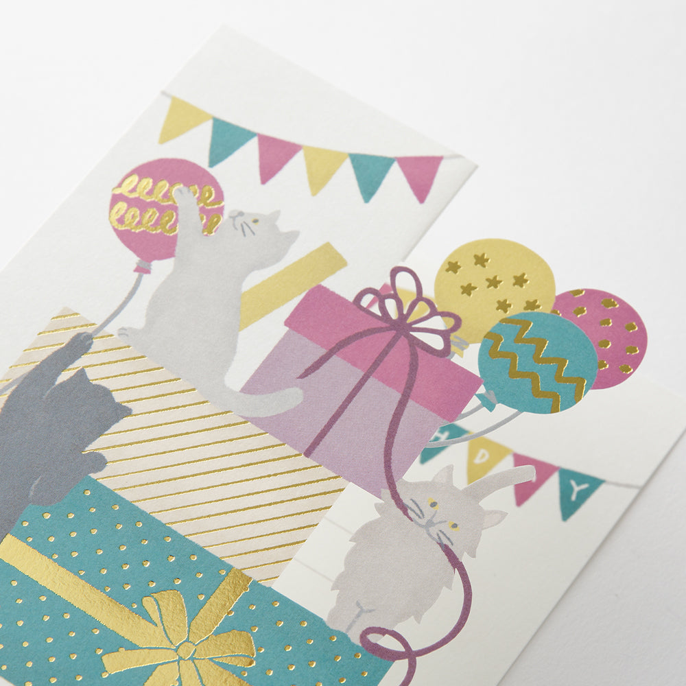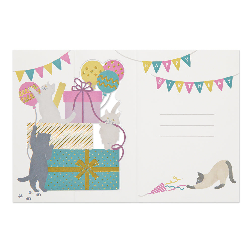 這是一個立體設計,收方可以在他或她的房間裡展示欣賞。賀卡設計呈現可愛的貓在一堆禮物中嬉戲。 這是一張適合祝賀生日的卡片,就像貓在用許多禮物慶祝一樣。