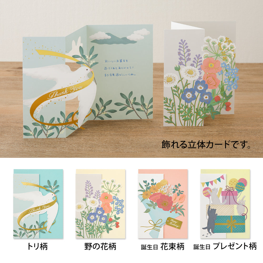 這張賀卡是三折式的,可以稍微打開即可自立展示。 當卡片站立時,祝禮語從正面不會很明顯,所以作為裝飾展示會很方便。