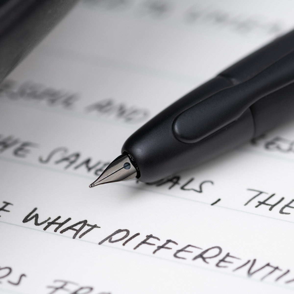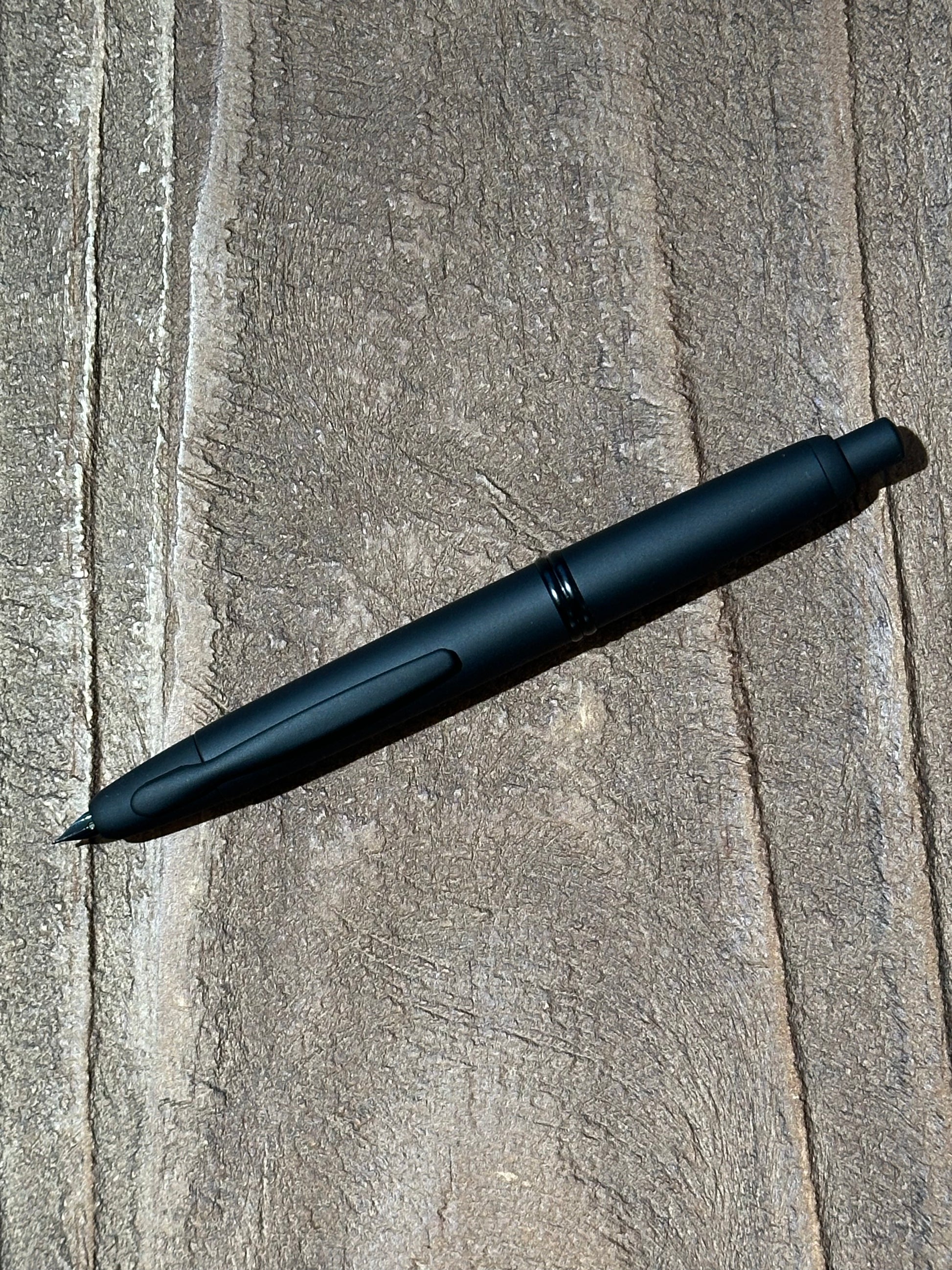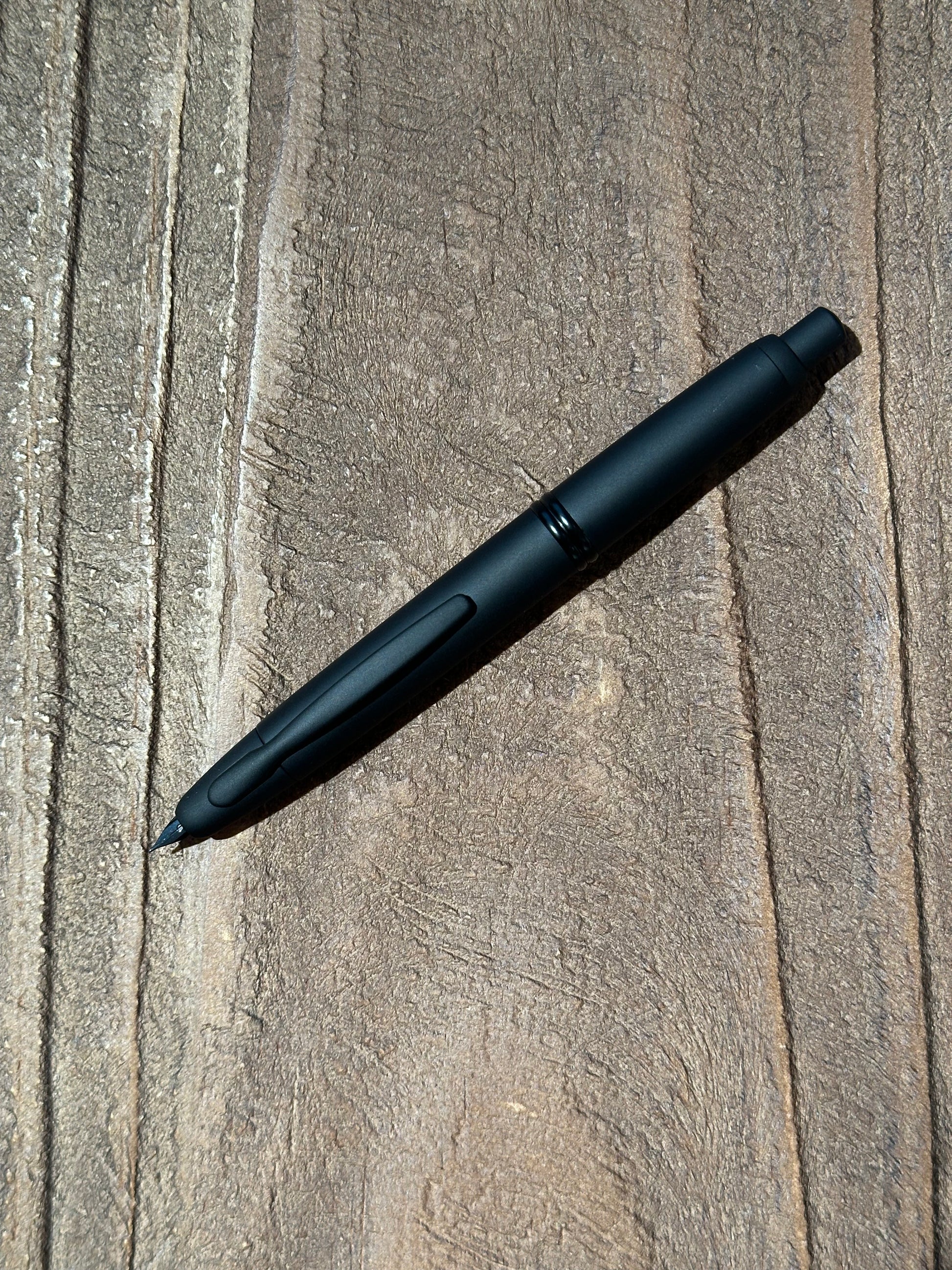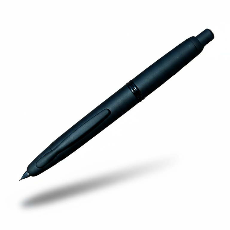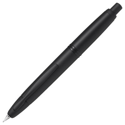 This PILOT Matte Black fountain pen is an exceptional masterpiece that houses a mechanism of unmatched precision, allowing the nib to retract seamlessly into the barrel, a feature that embodies both practicality and elegance. The PILOT in-house 18K gold nib features black ion plating, paired beautifully with the Matte Black trim accents, against a soft-touch Matte Black brass barrel.