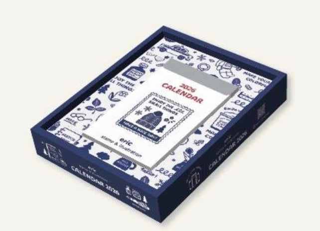 A calendar filled with cute illustration by rubber stamp illustrator eric. Each day is decorated with a different cute illustration by eric. A small calendar that makes you want to look at after flipping each page.