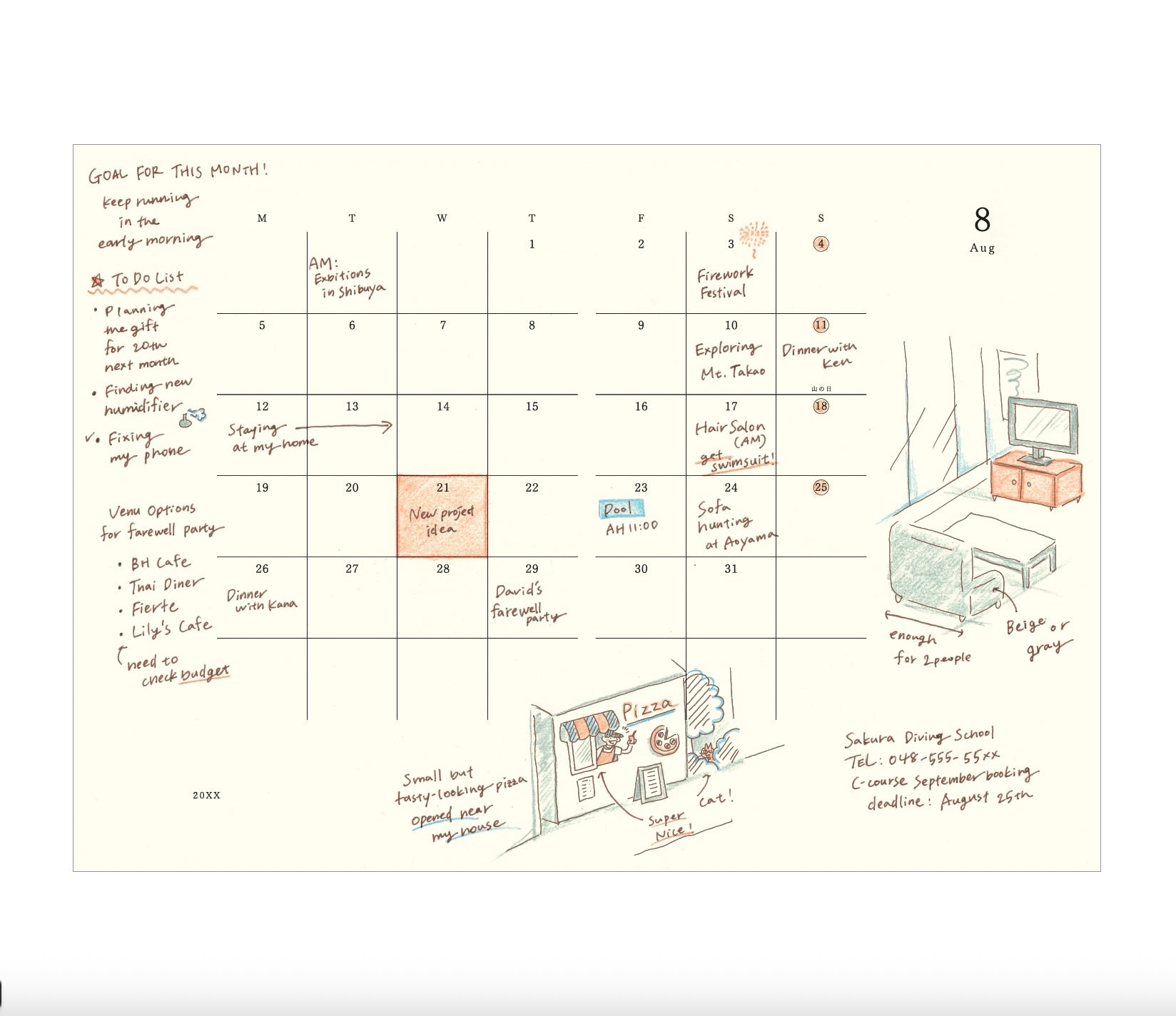 It consists of monthly schedule pages similar to "MD Notebook Diary" and 385 free pages. In addition to managing the time schedule, the free pages provide space for writing text and drawing illustrations.