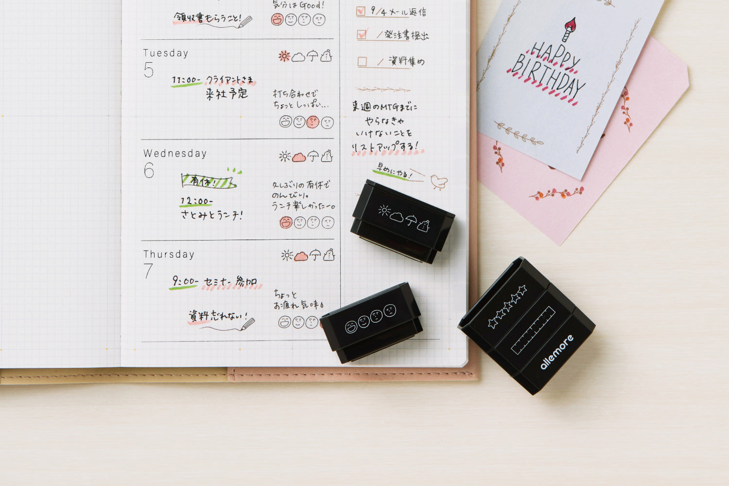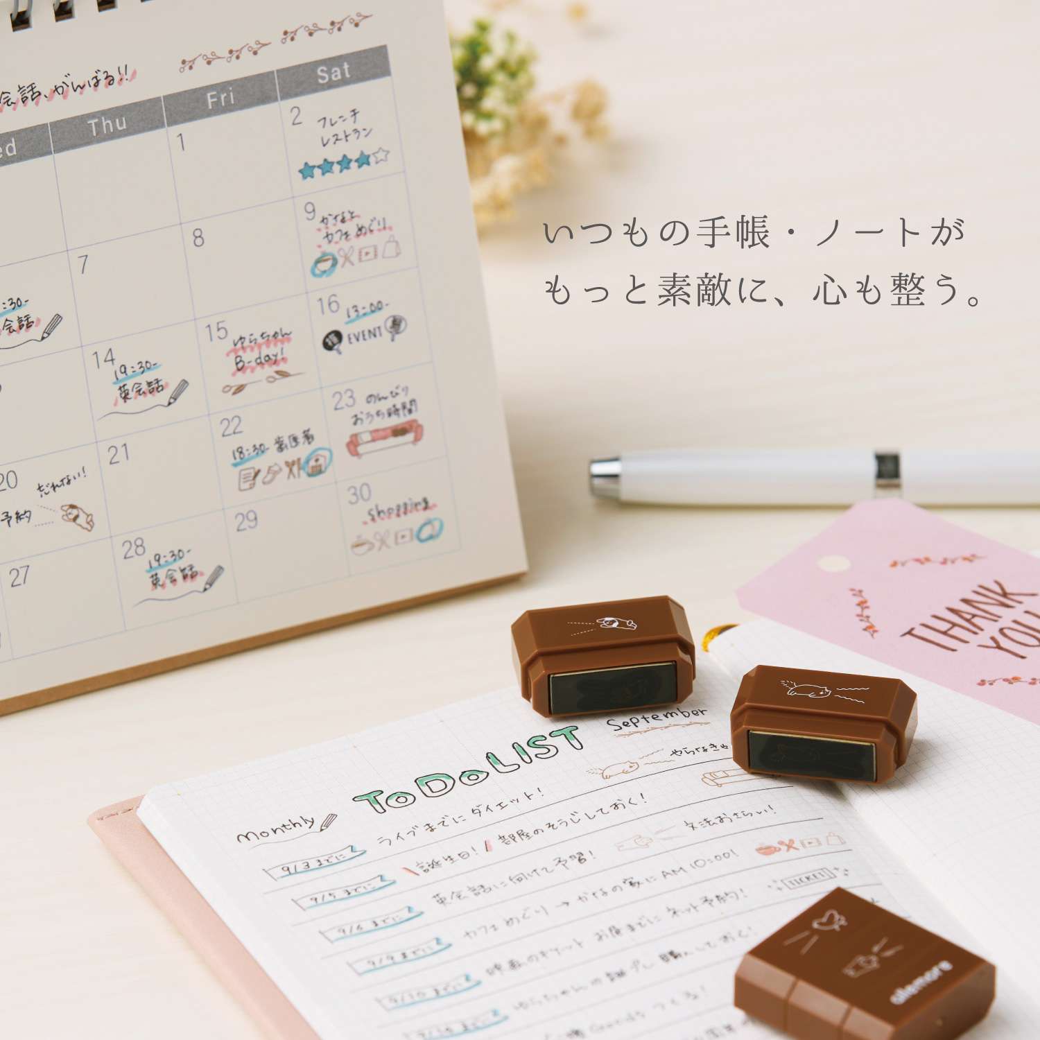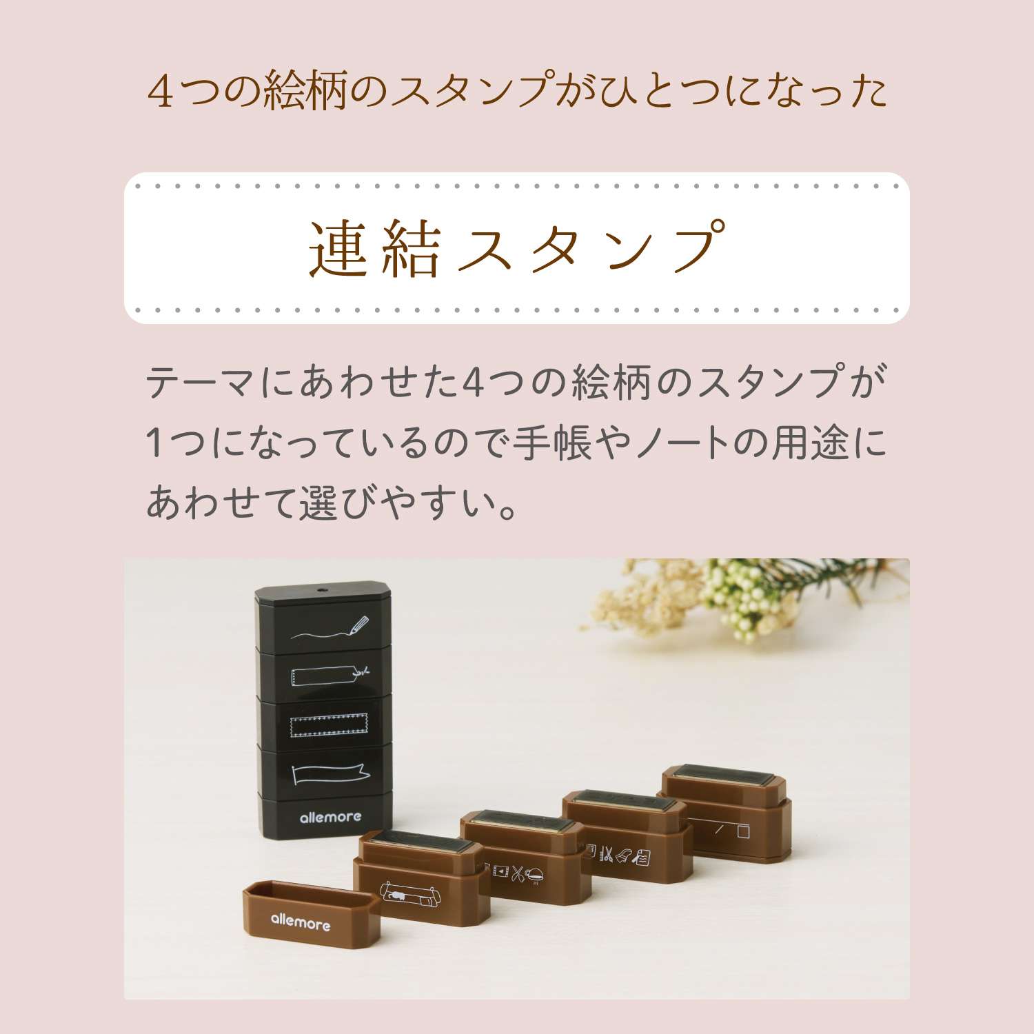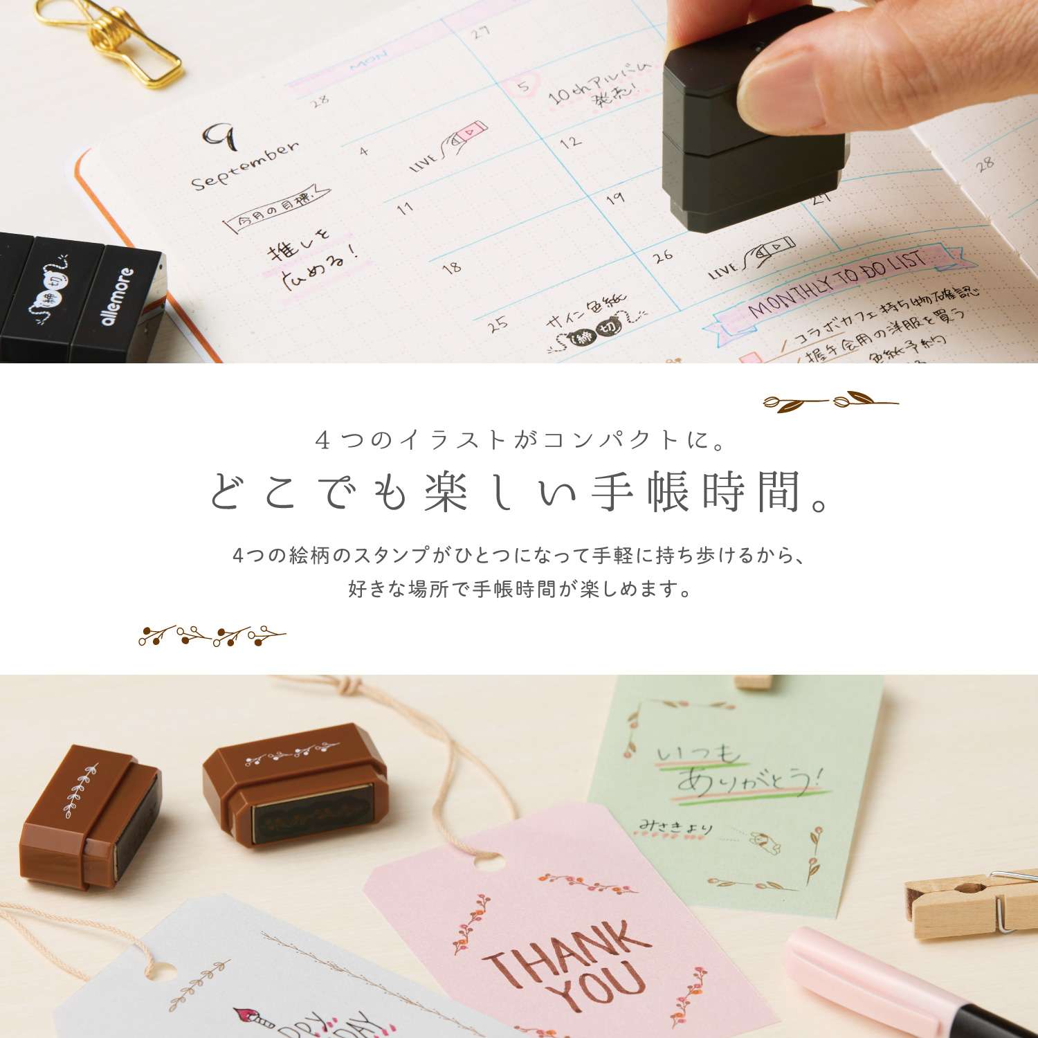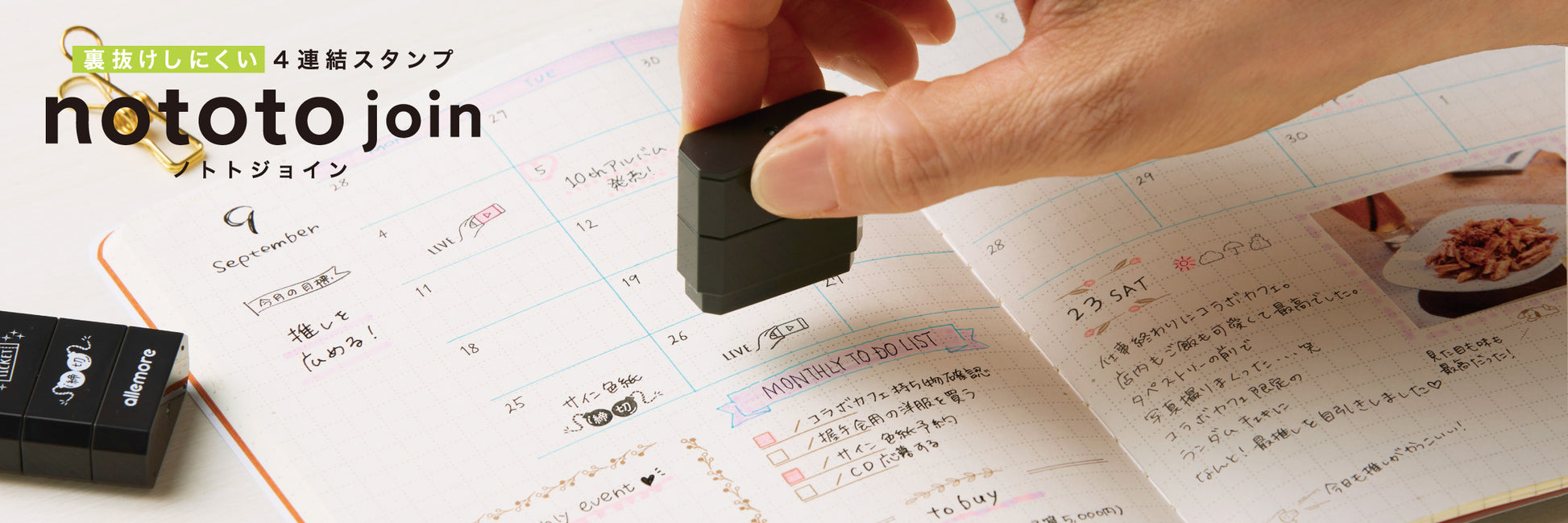 "nototo join" stamp is a connected stamp that combines stamps with 4 different patterns of the same theme. You can easily carry stamps with 4 patterns in one, so you can enjoy your journaling time wherever you like.