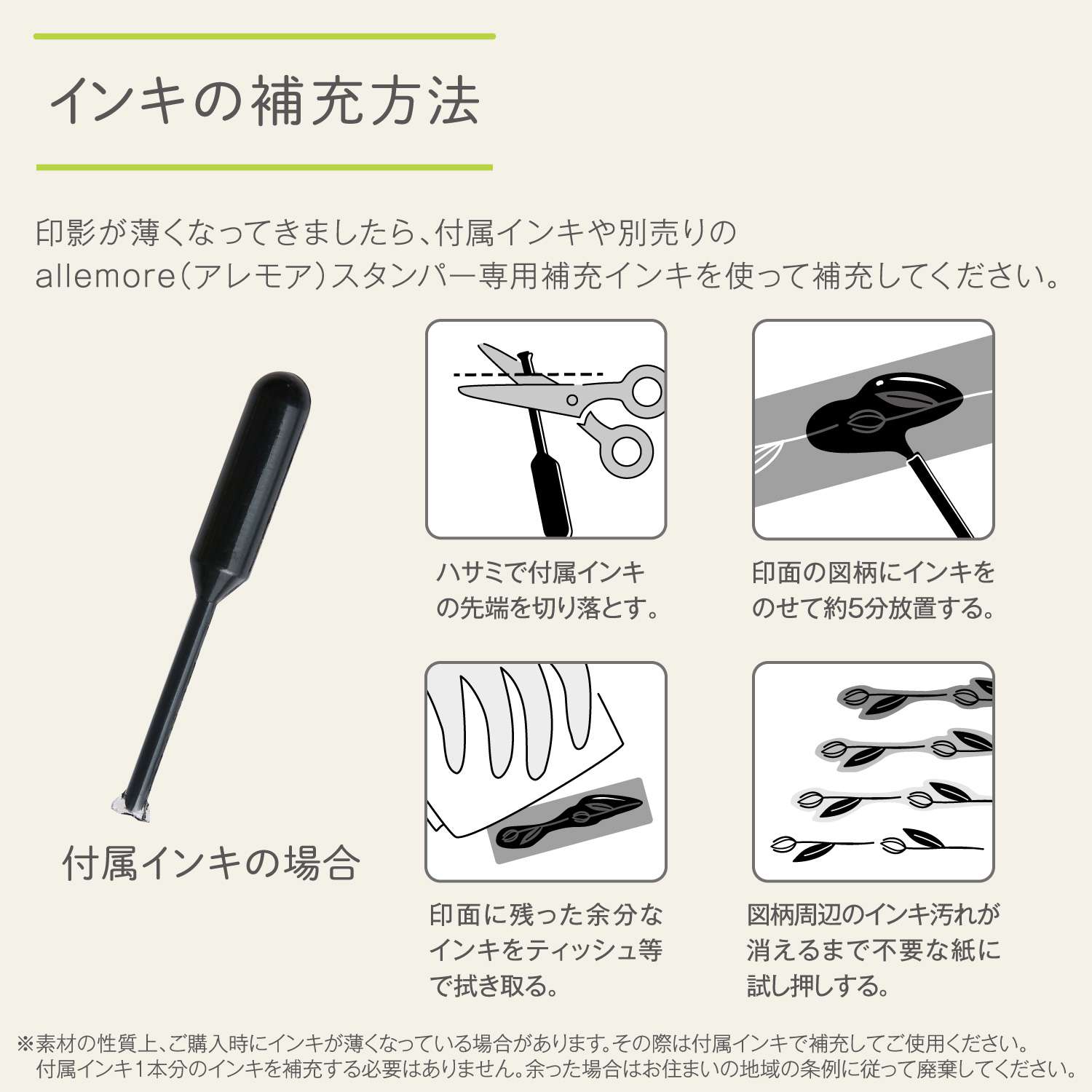 *Due to the nature of the material, the ink may be thin at the time of purchase. In that case, please replenish with the included ink before using it. There is no need to refill one bottle of the included ink. If there is any excess, please dispose of it accordingly.