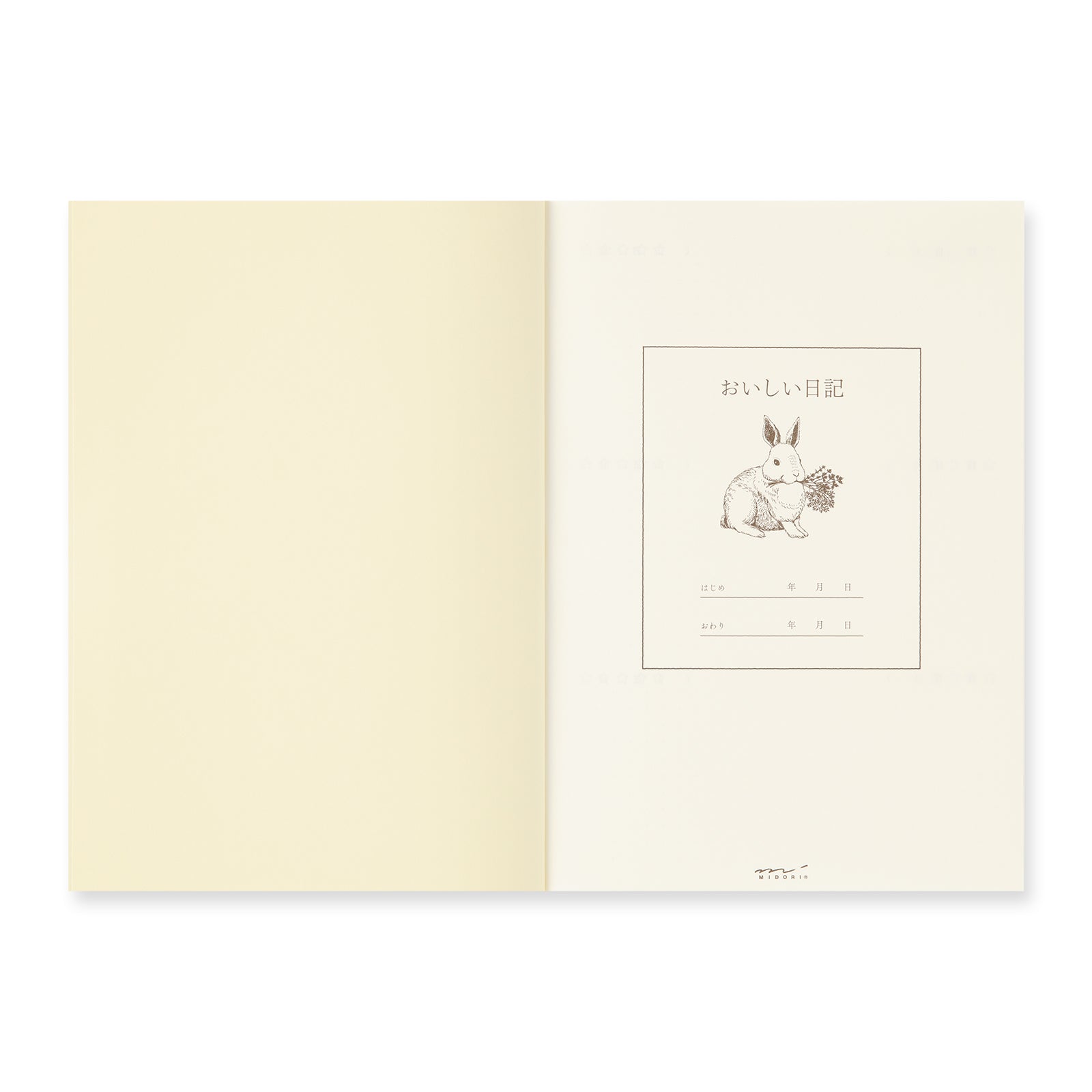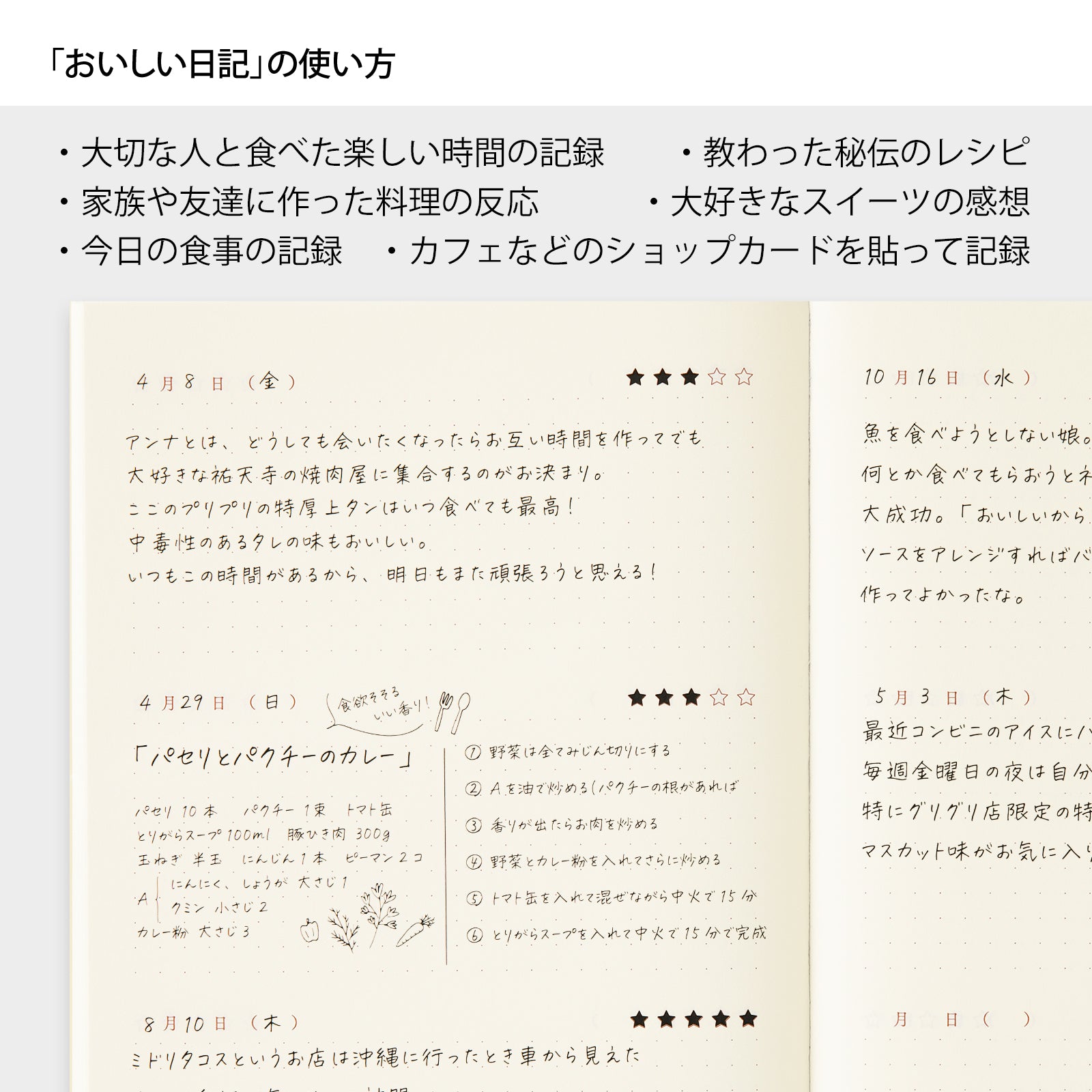 A diary for recording gourmet memories — meals that impressed you, secret family recipes, or favourite restaurants. The dot grid format allows free writing or drawing, and you can rate your satisfaction using five star marks.